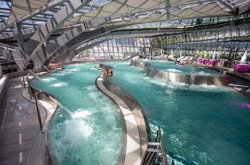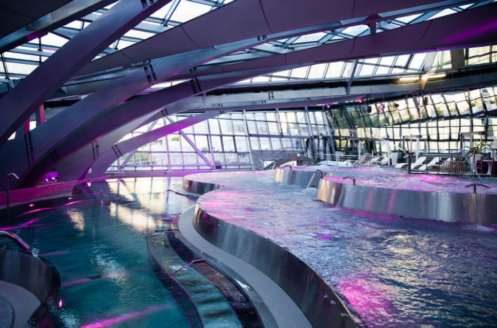 • El espectacular espacio interior con tres lagunas en forma de cascadas cuenta con asientos de agua, cuellos de cisne y multitud de surtidores de diferentes presiones que te proporcionarán masajes en diversas partes del cuerpo. La textura del acero inoxidable de las lagunas combinado con los juegos de luz, configuran un incomparable entorno vanguardista.
