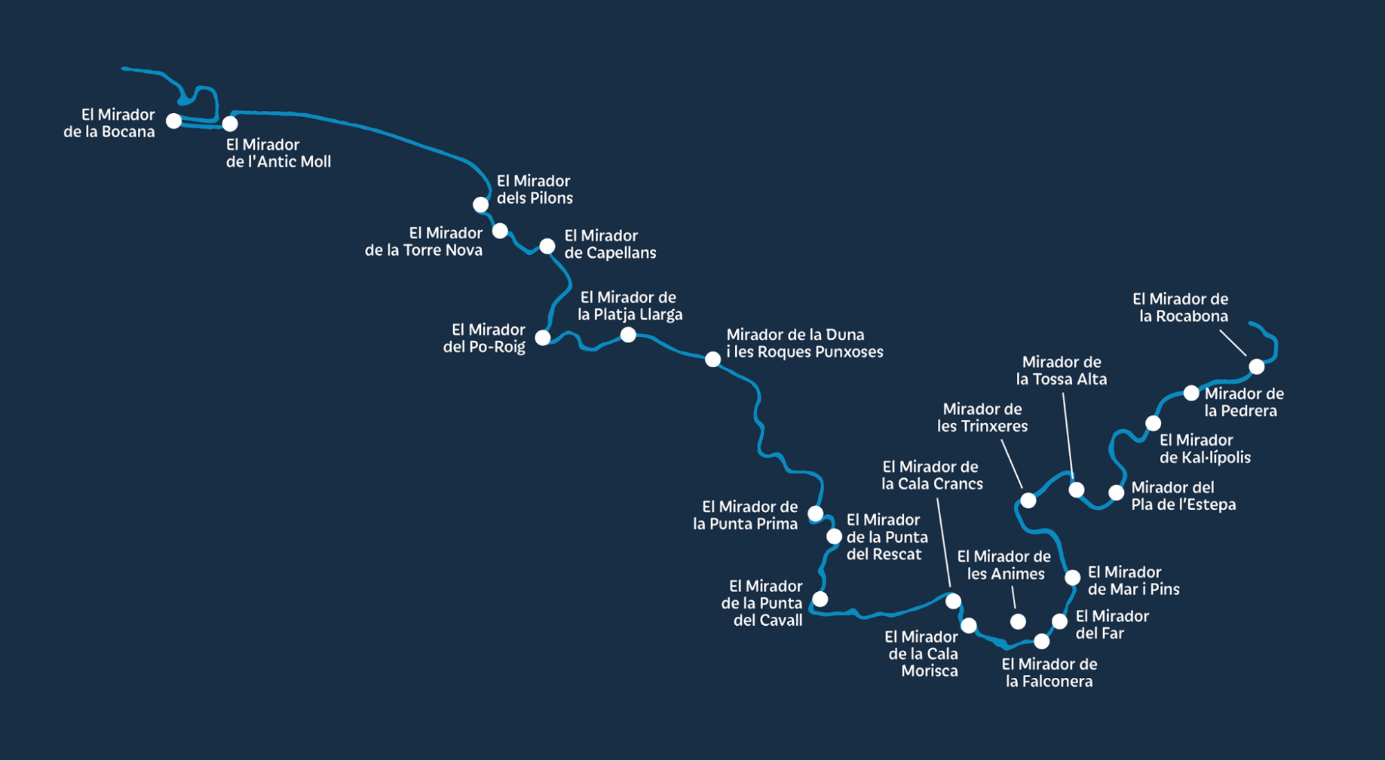 ℹ Con la Ruta de los Miradores conocerás 23 espectaculares miradores que conforman un agradable camino para pasear bajo el cielo abierto y asoleado de la Costa Dorada, este es el recorrido que tienes que hacer: