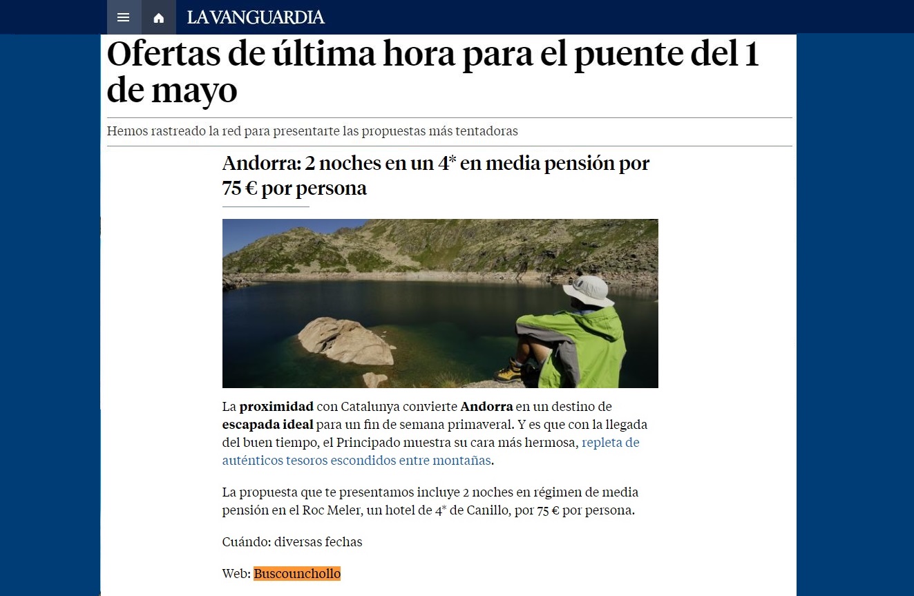 El periódico La Vanguardia ha publicado uno de nuestros chollo a Andorra para viajar el puente de mayo. El viaje consiste en 3 días y 2 noches en el Hotel Roc Meler 4* situado en Canillo, en régimen de media pensión y con 1 entrada de 1 h por persona al Spa del Hotel. Todo,...