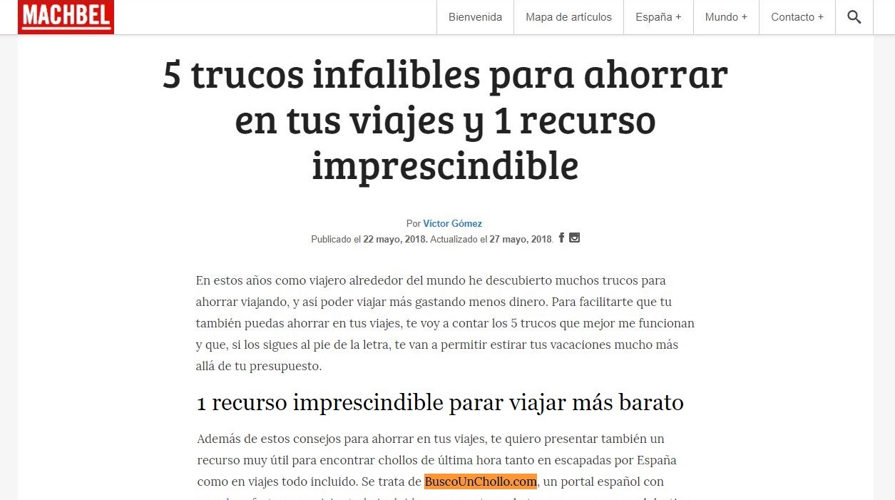 Machbel es una web de viajes que adora recorrer el mundo buscando las mejores ofertas del mercado, y para ellos somos su recurso imprescindible si quieres viajar por todo el globo terráqueo al mejor precio posible. Así lo dice en su última publicación, somo un portal web con las mejores ofertas todo incluido y en...
