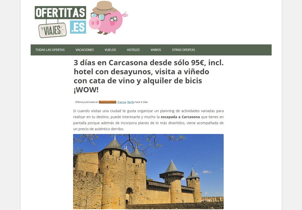 De nuevo el portal web de Viajesofertitas.es ha vuelto a publicar uno de nuestros chollos. Esta vez ha sido nuestro nuevo chollazo en Carcasona; el viaje incluye 1 noche en el Soleil Vacances Hotel Les Chevaliers en régimen de alojamiento y desayuno +1 visita al viñedo castillo Auzias + cata de vino+ 2 horas de alquiler...