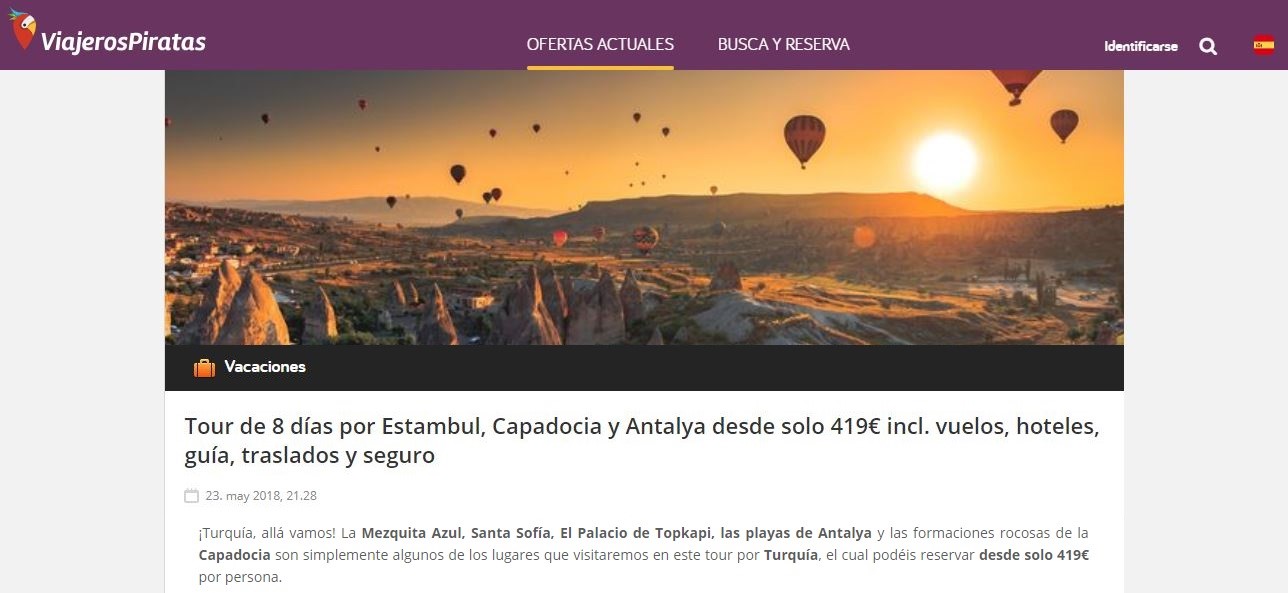 Nuestro fiel amigo y portal de viajes Viajeros Piratas ha vuelo a destacar varios de nuestros chollos para este verano. Los hay en la Costa Brava, en Grecia, en Peñíscola… Te hemos seleccionado el de Turquía. Este magnifico chollo consiste en un tour de 8 días por Estambul, Capadocia y Antalya desde solo 419€ incl. vuelos,...