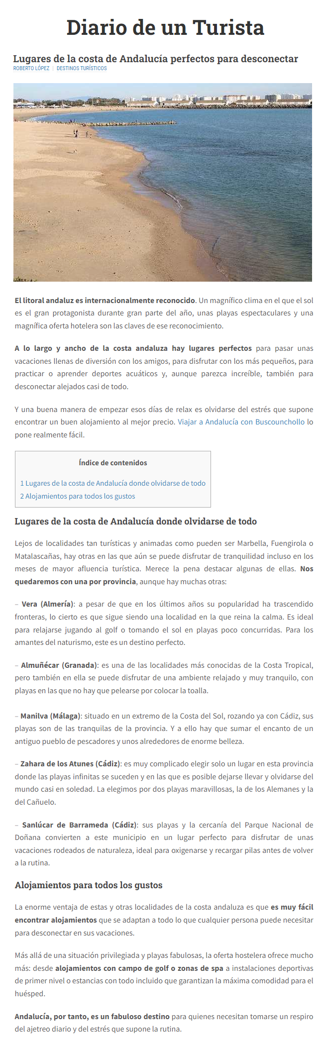 Si andas buscando buenas ofertas para conocer la costa andaluza somos tu web de confianza. El Diario de un Turista ha hecho una recopilación de las mejores localizaciones y nos ha mencionado como una de las webs más TOP para reservar tus vacaciones por ahí.