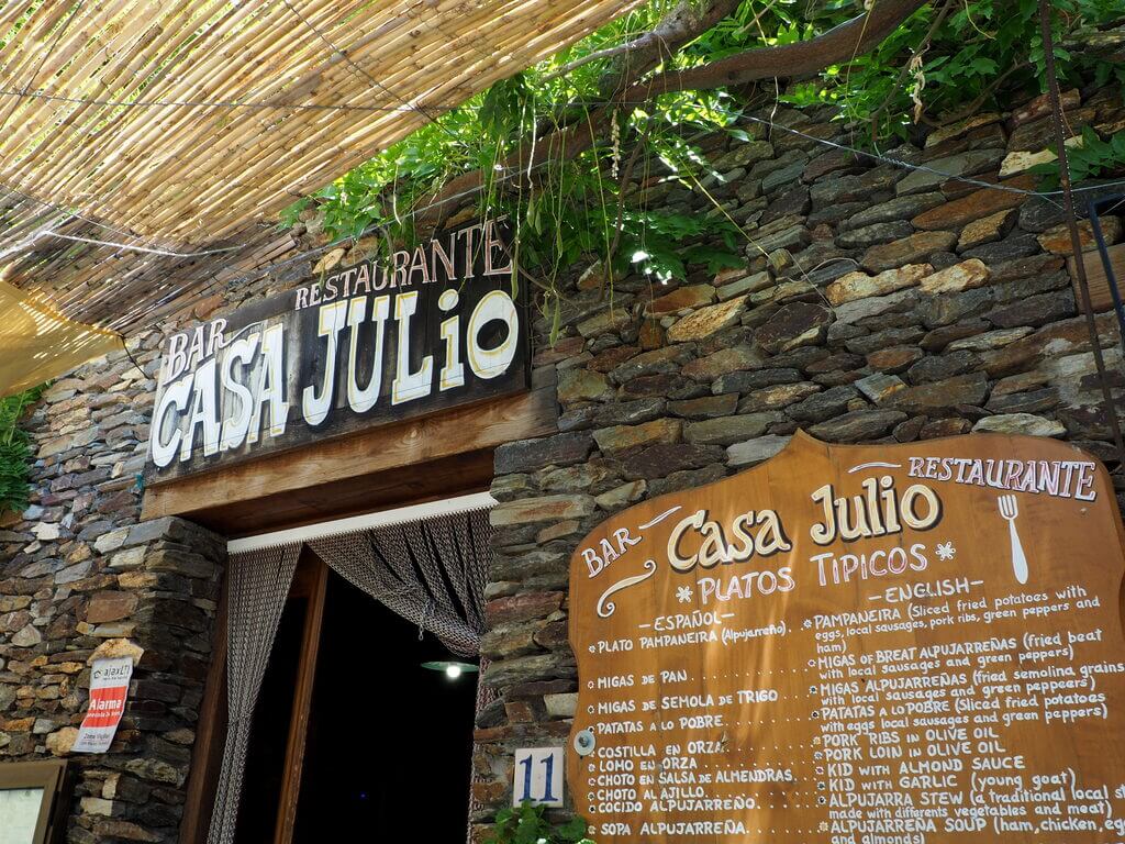 Casa Julio es un restaurante ubicado en el pueblo de Pampaneira y ofrece solamente comida casera y tradicional. Su carta está basada en los mejores ingredientes de la comida mediterránea, pero sin olvidar los platos más contundentes de la alta montaña. En este restaurante podrás probar las migas o el cocido alpujarreño, que como dicen ellos, resucita a los muertos.