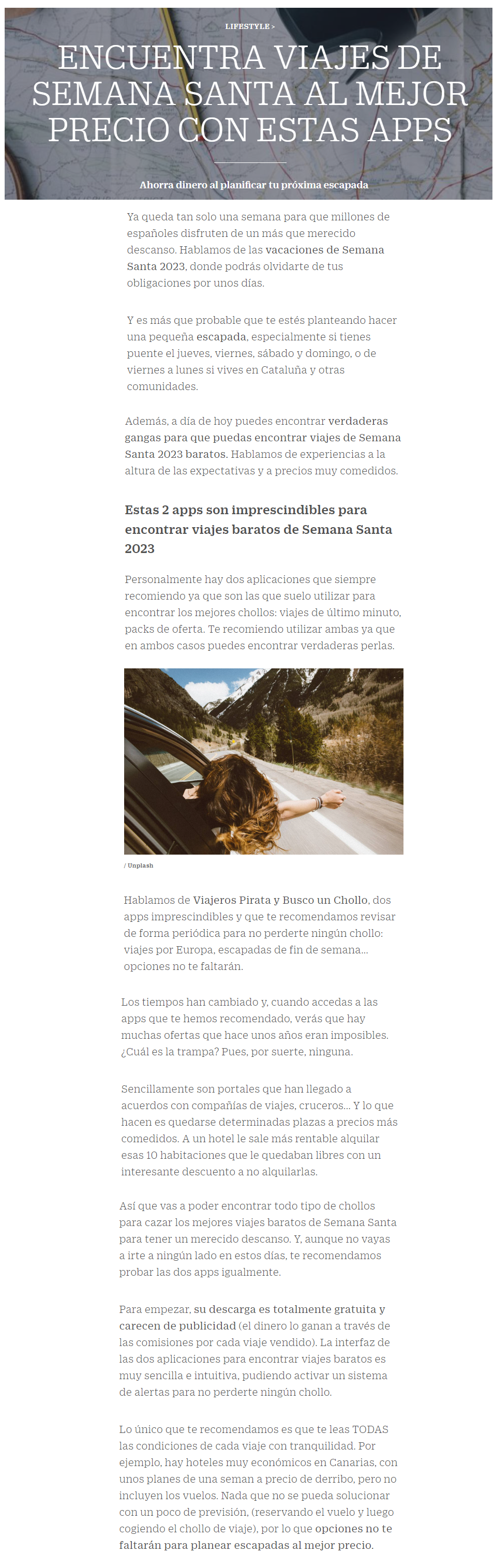 Encontrar viajes baratos puede ser fácil si sabes dónde buscar. Esta vez en el medio de Cinco Días (El País), en la sección de Lifestyle, podrás encontrar el secreto para dar con ellos siempre que quieras. Ya que nos mencionan por ser una de las apps de viajes líderes y referentes en este ámbito.