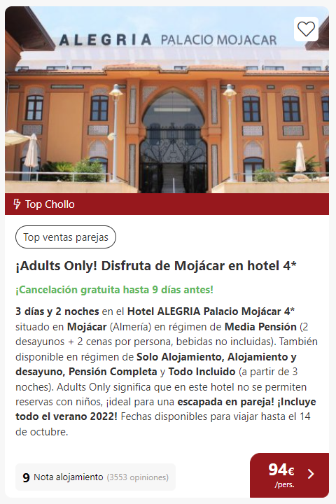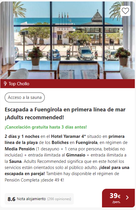 Una vez llegues no tendrás que preocuparte por nada porque por tan solo 47 € Te alojarás en media pensión una noche en un hotel solo para adultos 🤭 Tu tranquilidad estará garantizada. ✅ Si quieres saber más, aquí te contamos todo sobre el alojamiento.