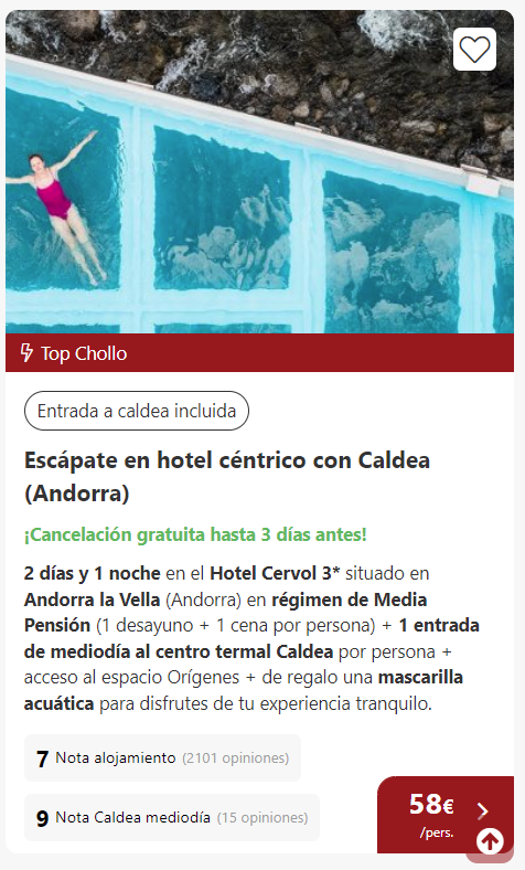 🍽 Te espera una cena, otra noche con tu acompañante y al día siguiente tendrás acceso al centro termal de Caldea con acceso al espacio Orígenes. ¡Así que sobre todo no te olvides de coger los trajes de baño para ambos días! 👙 ¡Además, todo esto te saldrá por solo 58 € por persona! ¿Suena bien, eh? 😏
