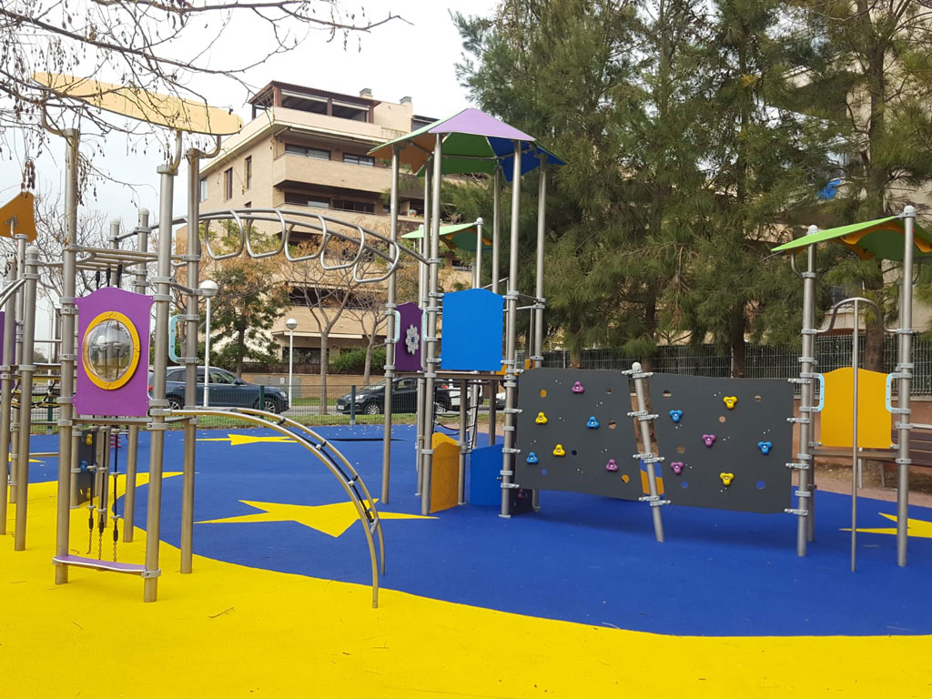 Los columpios de los parques disponen de una amplia variedad de asientos, para que puedan acceder a ellos niños de todas las edades y con todas las necesidades ⭐ El suelo en el que está construido el parque está cubierto con caucho regenerado para la seguridad de los más pequeños.