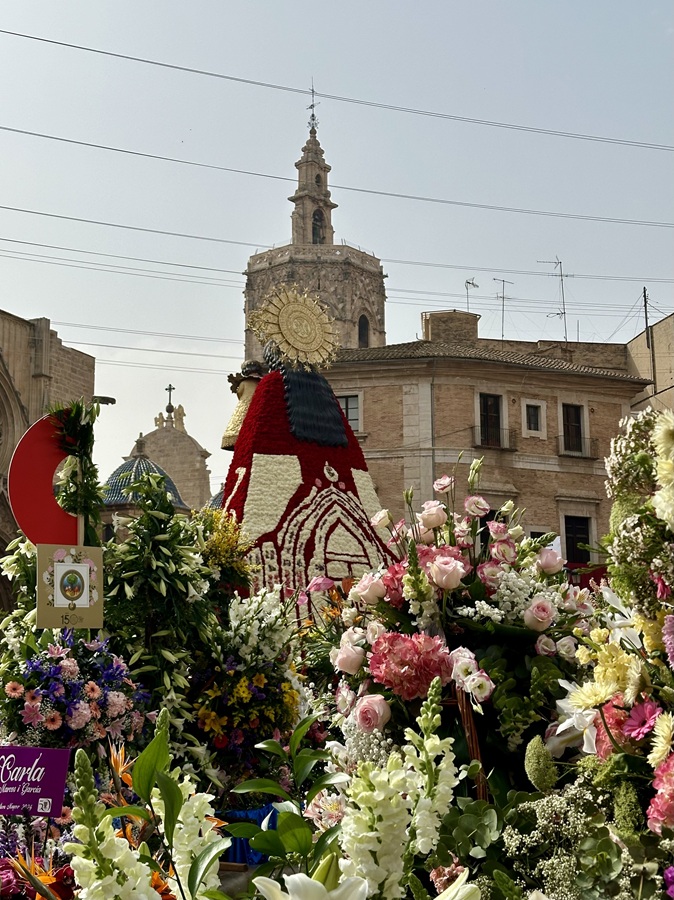 Allí, una representación inmensa de la “Geperudeta”, apelativo cariñoso que le dan los valencianos a su virgen, les espera para que vayan depositando las flores en su manto y lo tiñan de color. 💝