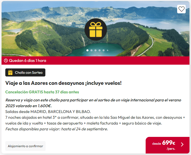 Ahora que ya tienes más información de las Azores y te han entrado ganas de ir (cómo a nosotros) tenemos una noticia que te va a encantar 😏 En BuscoUnChollo, aparte de conseguirte chollazos de viaje “en casi todos los destinos del mundo”… También preparamos sorteos y premiamos a nuestros mejores clientes.