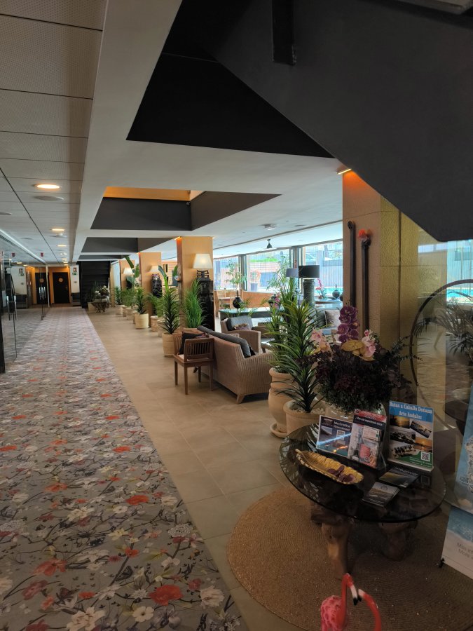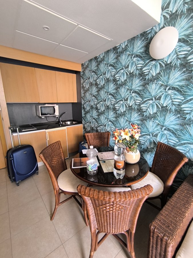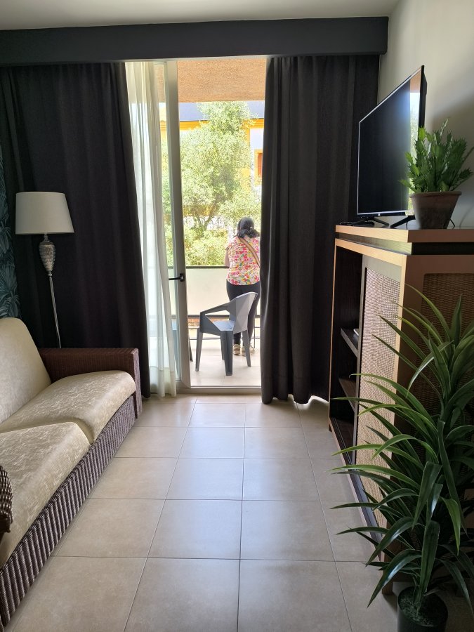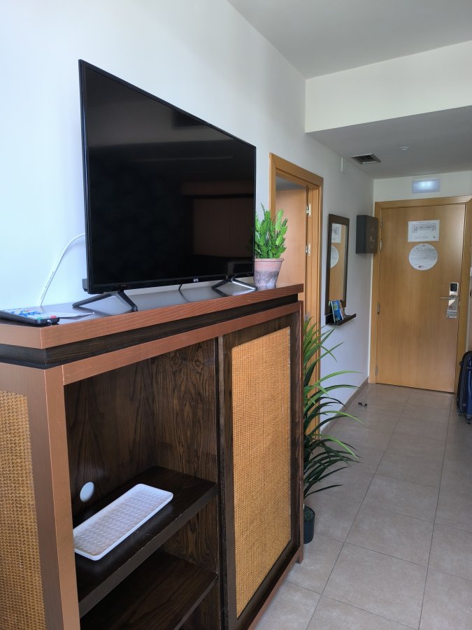 Las puertas correderas del armario ropero del dormitorio no cerraban bien, y se quedaban la mayor parte del tiempo abiertas, salvo que las cerraras con muchísimo cuidado. El menaje de cocina era muy escaso, solo 4 platos llanos, 4 hondos, una ensaladera y un frutero, ningún plato de postre, quizá los más necesarios. Los pedí en recepción pero me dijeron que solo podían darme 4 platos de desayuno. Una pena también que el enchufe del micro tal y como está inutilice cafetera y tostadora, que tenía que enchufar en otros enchufes del salón. En la piscina, había tardes que los niños pequeños jugaban a la pelota a pesar de estar prohibido. He echado de menos a alguien por parte del hotel que llamara la atención a los padres para que eso no volviera a ocurrir. A parte de estos problemillas menores, el resto muy bien