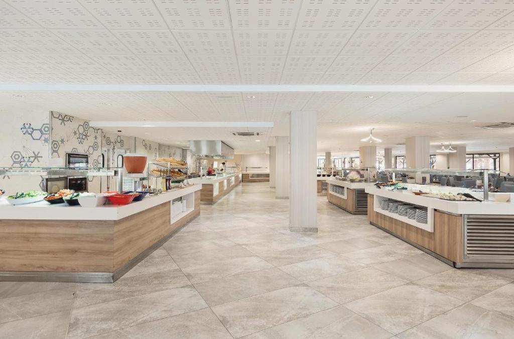 La terraza al aire libre del restaurante, la comida del buffet y el horario de las comidas.