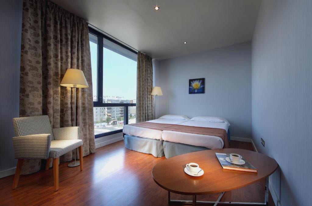 El hotel de estilo moderno, minimalista y con fachada de cristal ahumado, cuenta con 92 habitaciones dobles y 3 junior suites. Todas nuestras habitaciones disponen de mobiliario confortable y funcional, amplio cuarto de baño, con ducha ó bañera, secador de pelo, caja fuerte, minibar y televisión de pantalla plana.