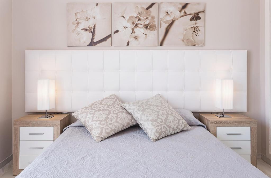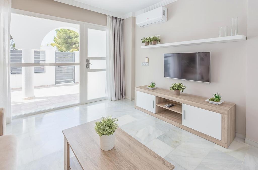 Apartamento superior 1 dormitorio: Dispone de 1 dormitorio con dos camas individuales y un salón con sofá cama, un baño completo, un aseo y cocina americana totalmente equipada (máquina de café, frigorífico, microondas y lavadora), aire acondicionado, plancha, armarios y Wi-Fi. También dispone de TV satélite, secador de pelo, caja fuerte (de pago) y menaje completo.
