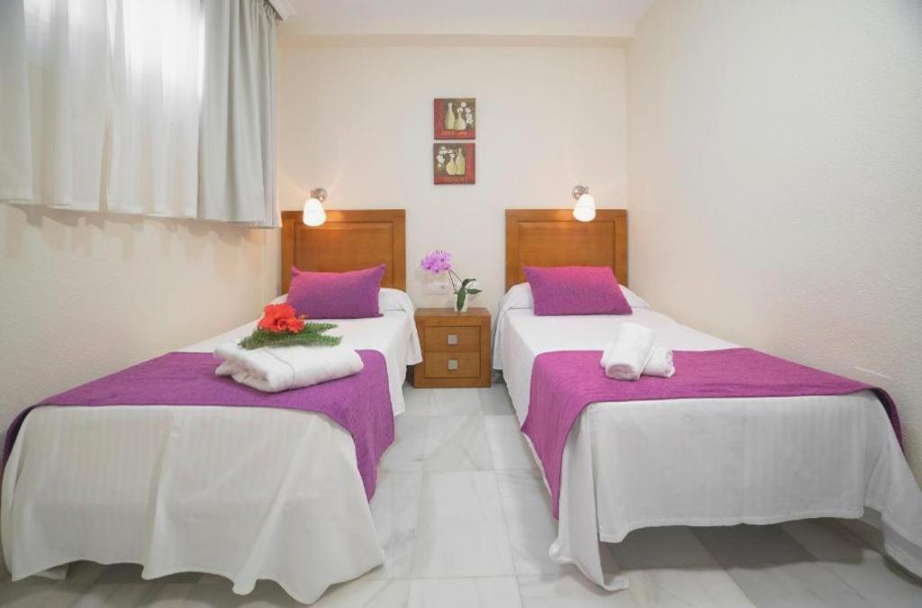 • Apartamentos 2 dormitorios (6 plazas): Cuenta con 2 habitaciones, una de ellas con 2 camas individuales y la otra con una cama de matrimonio, un sofá cama doble en el salón-comedor. La cocina está equipada con nevera, vitrocerámica, cafetera y microondas. El baño es completo con ducha o bañera.