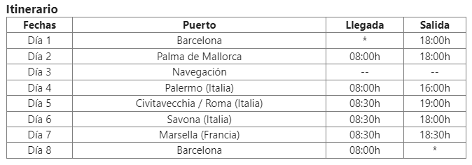 • Parada en Palma de Mallorca (España), Palermo (Italia), Civitavecchia/Roma (Italia), Savona (Italia), Marsella (Francia) y fin de viaje en Barcelona.