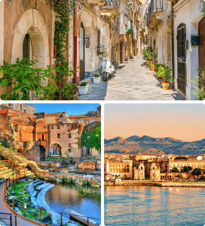 Recorre Palermo y déjate envolver por su mezcla de culturas y mercados llenos de vida. En Catania, siente la fuerza del Etna mientras paseas entre iglesias barrocas y sabores intensos. Descubre los templos milenarios de Agrigento, frente al mar, y déjate sorprender por la belleza de Siracusa, donde cada rincón es una postal.