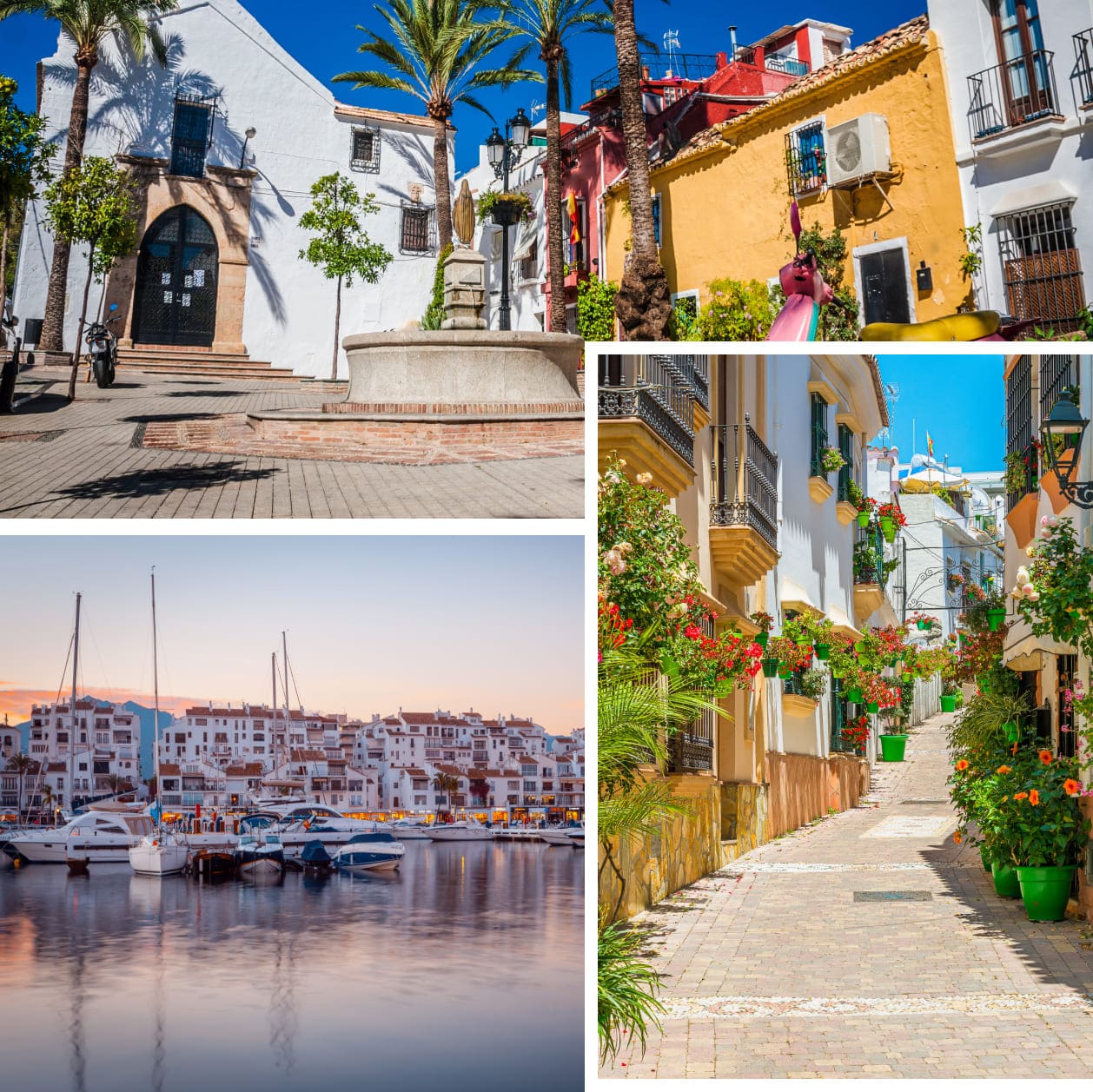 El casco antiguo de Marbella, con sus calles blancas, plazas llenas de vida como la Plaza de los Naranjos y la Iglesia de la Encarnación, conserva el encanto andaluz tradicional. También destaca el famoso Puerto Banús, símbolo del lujo internacional, donde se dan cita yates, boutiques exclusivas y coches de alta gama.