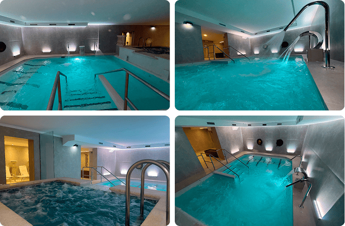 • La primera piscina cuenta con chorros cervicales, dorsales y de hombros, mientras que la segunda tiene chorros lumbares y de contra corriente para masaje en el abdomen y las piernas. Esto se combina con la última piscina, de agua caliente.