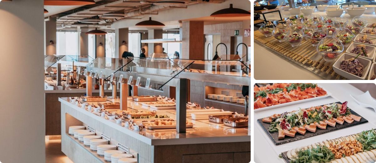 Quizás dividiría el buffet en 2 para no tener que ir de punta a punta para coger pan, postre...