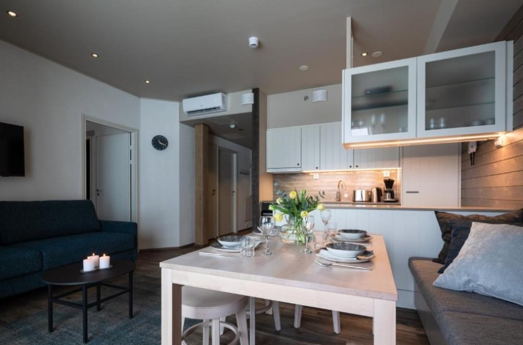 - En los Apartamentos Rukatonttu: te alojarás en Ruka Village Ski Resort, una de las estaciones de esquí alpino más grandes de Finlandia. Te alojarás en Pensión Completa (agua incluida), excepto los almuerzos del 13, 14, 27 y 28 de diciembre.
