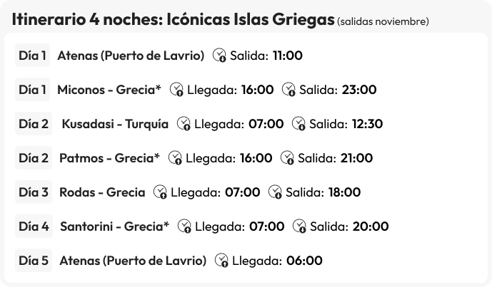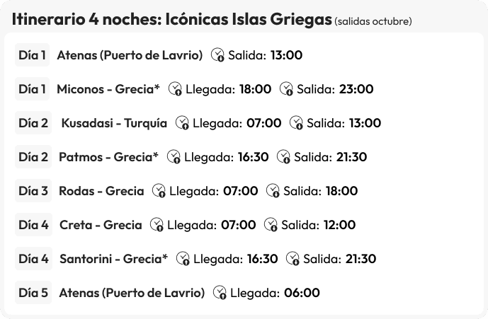 La hora de embarque es de 09h a 12h, en el puerto de El Pireo (Atenas).