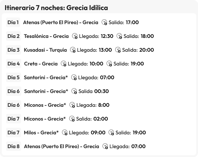 - Parada en Míkonos (Grecia), Kusadasi (Turquía), Patmos (Grecia), Heraklion (Grecia), Santorini (Grecia), fin de viaje en Atenas.
