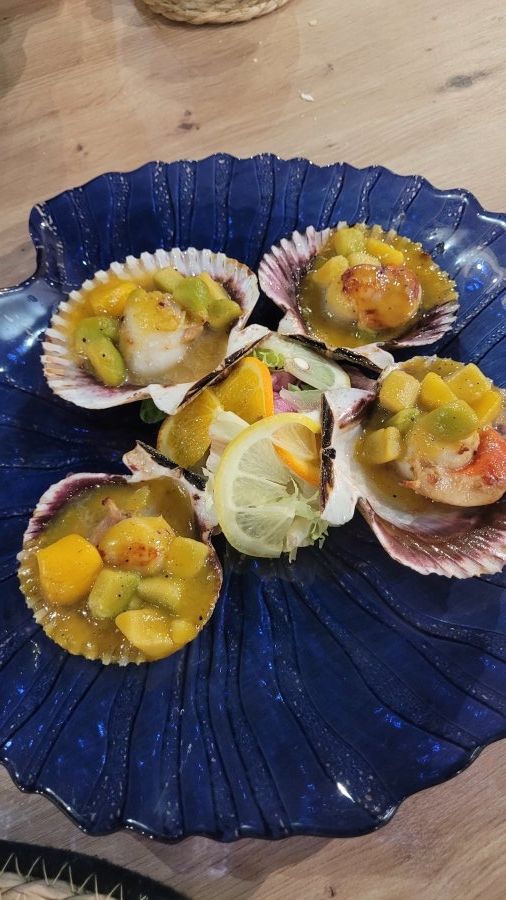 • Zamburiñas braseadas con vinagreta de mango y aguacate.