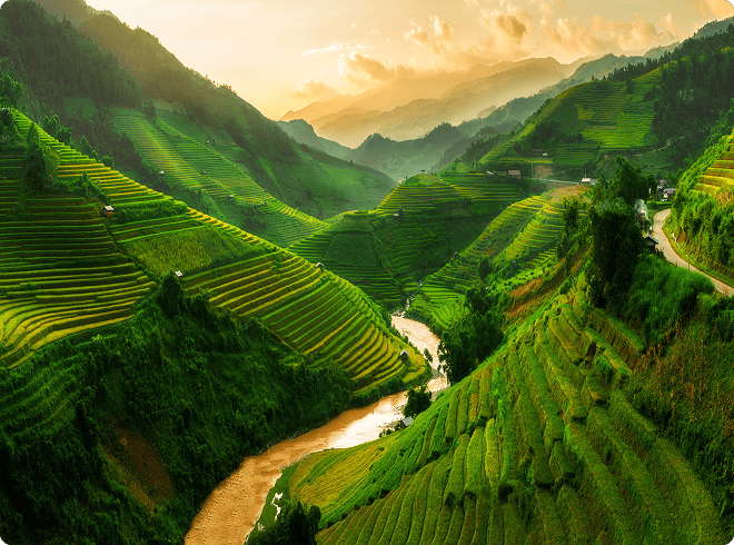 • El paisaje de Vietnam es tan diverso como su cultura. Desde los campos de arroz en terrazas de Sapa en el norte, hasta las playas doradas y aguas cristalinas de la costa central y sur. El país también es hogar de montañas imponentes, como las que rodean el paso de Hai Van, y ríos majestuosos como el Mekong, que serpentea a través del delta del sur.