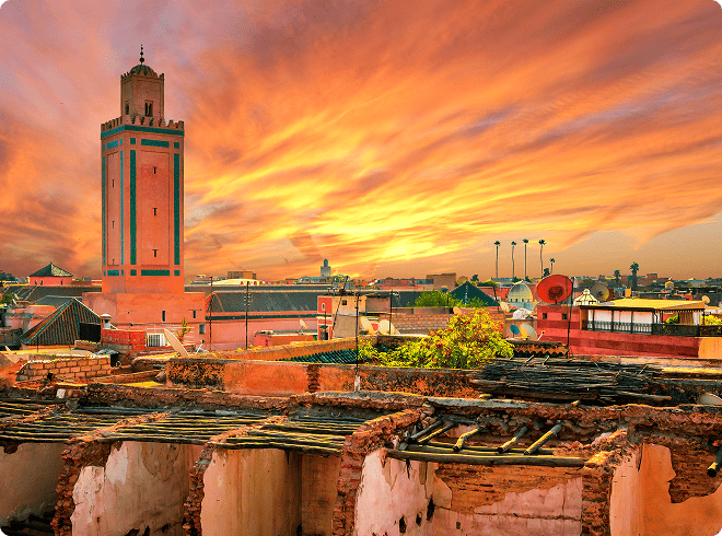 Marrakech es una antigua ciudad imperial en el oeste de Marruecos y un relevante centro económico con mezquitas, palacios y jardines. La medina es una ciudad medieval amurallada y densamente poblada que data del período del Imperio Bereber, con pasajes que parecen laberintos y animados zocos (mercados) que venden cerámicas, joyas y tejidos tradicionales.