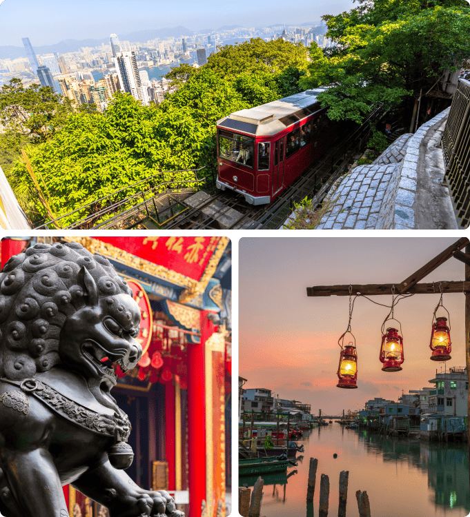 En cada esquina encontrarás historia y tradición. Visita el Templo Wong Tai Sin, recorre la aldea pesquera de Tai O o sube en tranvía al Victoria Peak, desde donde tendrás una vista panorámica espectacular del skyline y la bahía de Hong Kong.