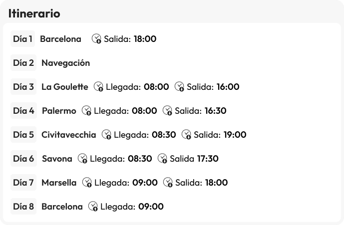 Este crucero por el Mediterráneo sale desde Barcelona y recorre cinco joyas en una sola semana: La Goulette, con su esencia tunecina y bazares exóticos; Palermo, entre palacios y aromas sicilianos; Civitavecchia, la puerta a la eterna Roma; Savona, puro sabor italiano en la Riviera; Marsella, con su mezcla de mar y vida urbana; y de vuelta a la vibrante Barcelona.