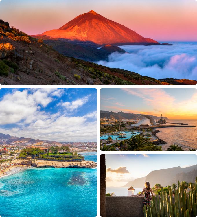 Tenerife, la mayor de las Islas Canarias, se encuentra en el océano Atlántico, frente a la costa africana pero perteneciente a España. Es una isla de contrastes, donde podrás pasar del mar a la alta montaña en menos de una hora. Con su clima primaveral todo el año, es un destino perfecto tanto para quienes buscan relax como para los amantes de la naturaleza y la aventura. Ideal para familias, parejas y viajeros que desean combinar playa, gastronomía y paisajes únicos.