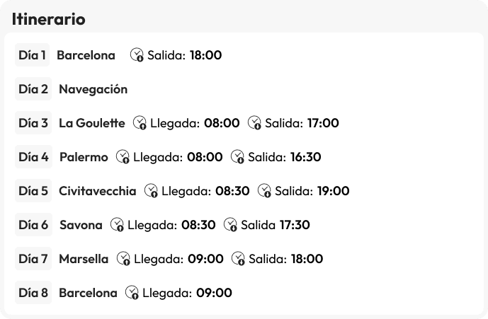 Este crucero por el Mediterráneo sale desde Barcelona y recorre cinco joyas en una sola semana: La Goulette, con su esencia tunecina y bazares exóticos; Palermo, entre palacios y aromas sicilianos; Civitavecchia, la puerta a la eterna Roma; Savona, puro sabor italiano en la Riviera; Marsella, con su mezcla de mar y vida urbana; y de vuelta a la vibrante Barcelona.