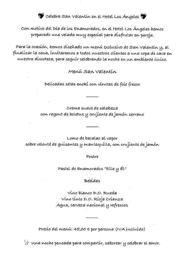 • La noche del sábado 14 de febrero te espera una cena especial cuidadosamente elaborada por el hotel y, para alargar la velada, baile en su discoteca. Un plan perfecto para disfrutar la noche al máximo.