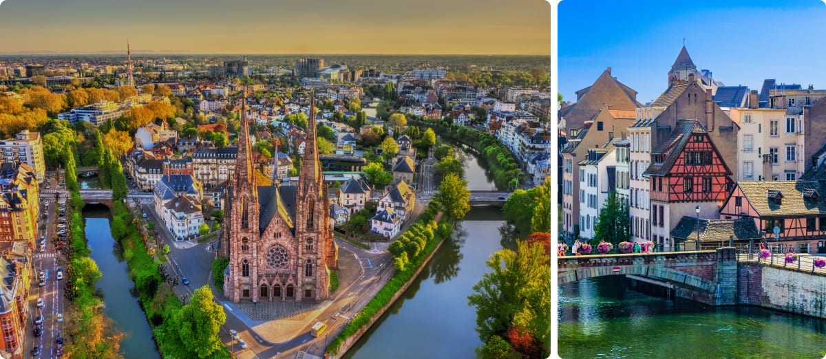 Capital de Alsacia y sede oficial del Parlamento Europeo y del Consejo de Europa, combina identidad francesa y alemana. Su centro histórico, declarado Patrimonio de la Humanidad por la UNESCO, está dominado por la majestuosa Catedral de Notre-Dame, obra maestra del gótico europeo. El barrio de La Petite France, con canales y casas de entramado de madera, ofrece una de las estampas más pintorescas del país. Es además uno de los destinos más emblemáticos de Europa durante la Navidad gracias a su histórico mercado navideño.