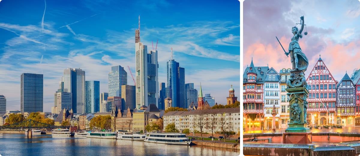Principal centro financiero de Alemania y sede del Banco Central Europeo, Frankfurt sorprende por su contraste entre modernos rascacielos y su casco histórico reconstruido. La plaza Römerberg es el corazón tradicional de la ciudad, rodeada de casas típicas y edificios históricos. A orillas del río Meno se concentran importantes museos en la conocida Museumsufer. Además de su relevancia económica, ofrece una animada vida cultural y gastronómica.