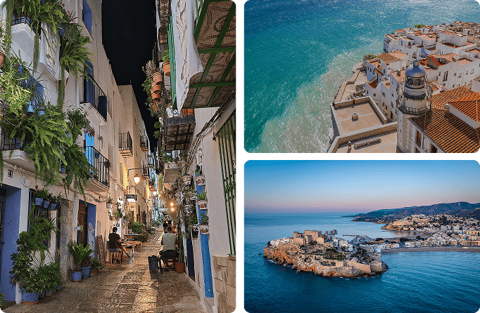 El gran protagonista es el Castillo del Papa Luna, una fortaleza medieval construida por los templarios que se alza sobre un peñón rodeado por el Mediterráneo y ofrece unas vistas espectaculares. A sus pies se extiende el casco antiguo de Peñíscola, con calles empedradas, casas blancas y rincones llenos de flores que invitan a perderse sin prisas. También merece la pena recorrer el Parque Natural de la Sierra de Irta, un espacio protegido con calas vírgenes y senderos junto al mar, y pasear por el animado Paseo Marítimo, perfecto para disfrutar del ambiente costero al atardecer.