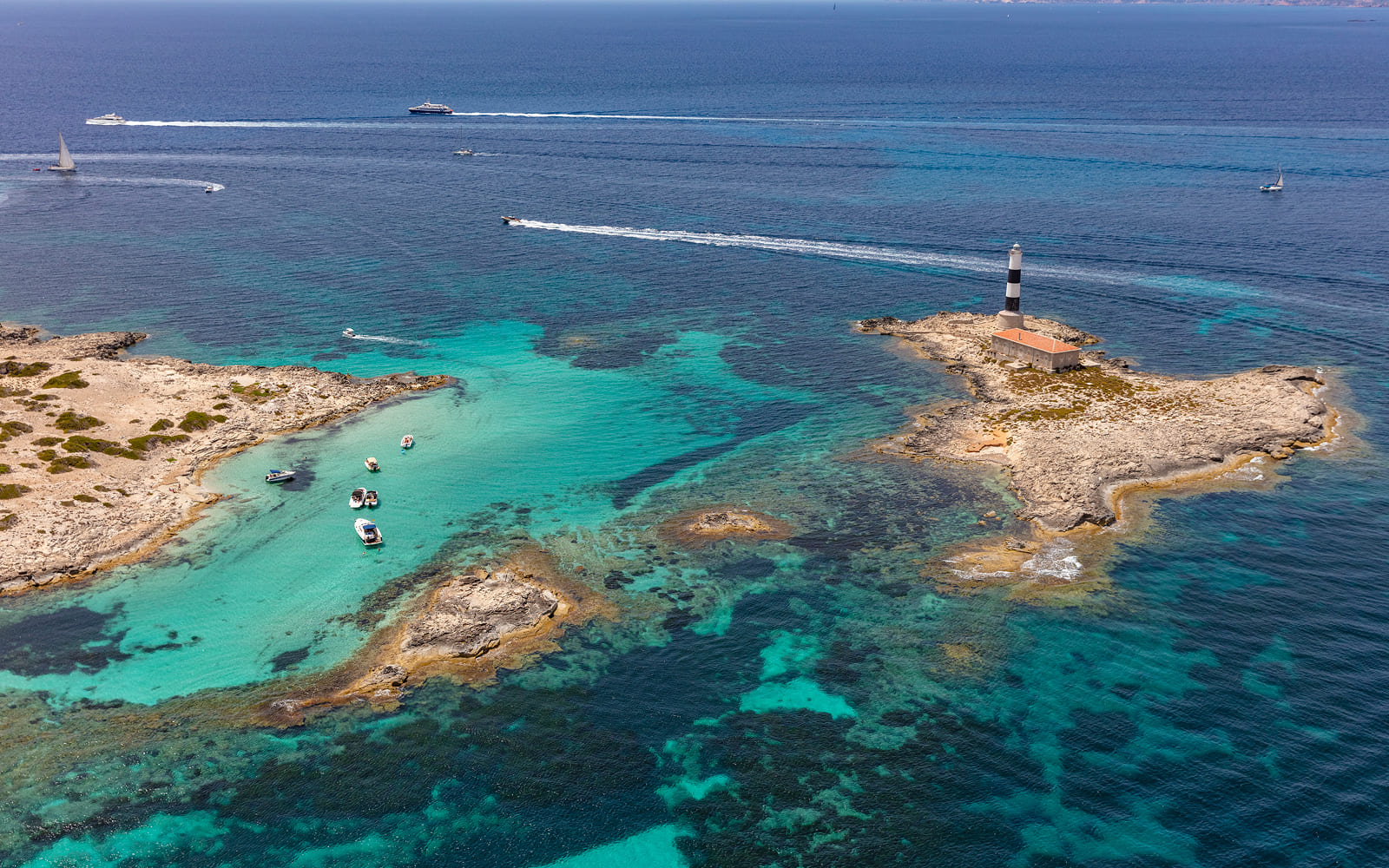 Desde Formentera puedes hacer una escapada en barco a Espalmador, una isla deshabitada con playas vírgenes y aguas poco profundas. También es posible visitar Ibiza en ferry, perfecta para una jornada de cultura, compras o ambiente animado sin alejarse demasiado.