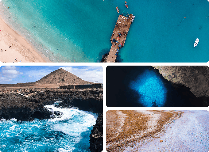 Uno de los lugares más emblemáticos es Santa María, el principal pueblo turístico de la isla, conocido por su ambiente animado, sus casas de colores y su largo muelle de pescadores donde cada día llegan las capturas del Atlántico. También merece la pena visitar las Salinas de Pedra de Lume, situadas dentro del cráter de un antiguo volcán, donde podrás bañarte en sus aguas saladas con un efecto de flotación similar al del Mar Muerto. Otro punto interesante es Buracona y el Ojo Azul, una piscina natural entre rocas volcánicas donde, en determinadas horas del día, la luz del sol crea un espectacular reflejo azul intenso en el agua.