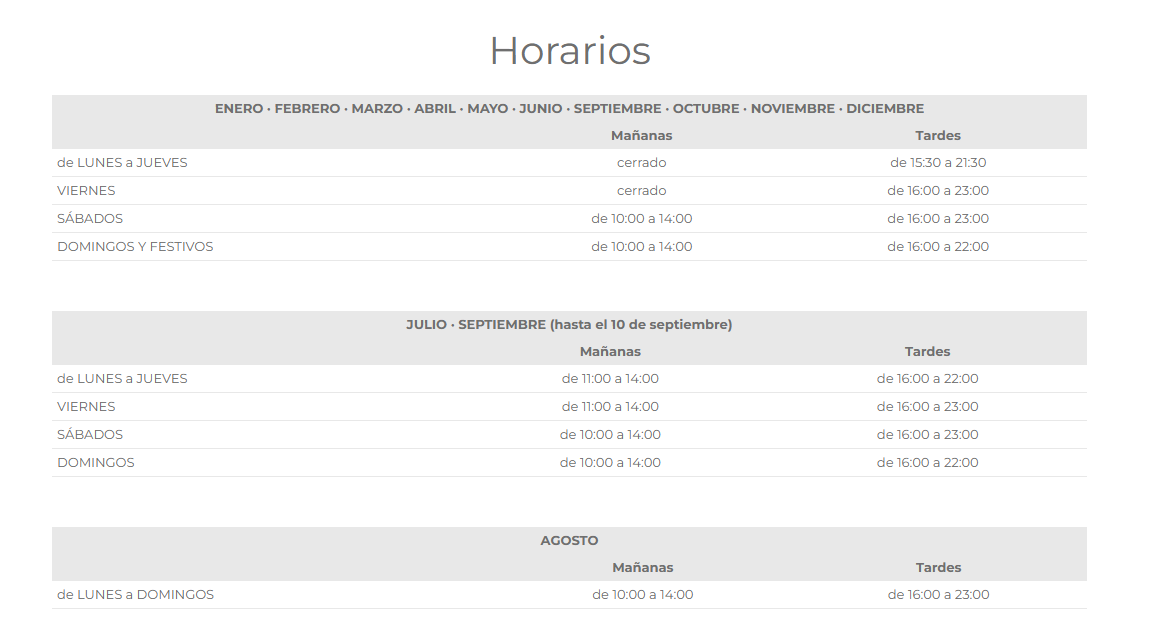 - Horario: de lunes a sábado de 9:30 h. a 14:00 h. y 16:30 h a 20:00 h. el domingo de 9:30 a 14:00 h.