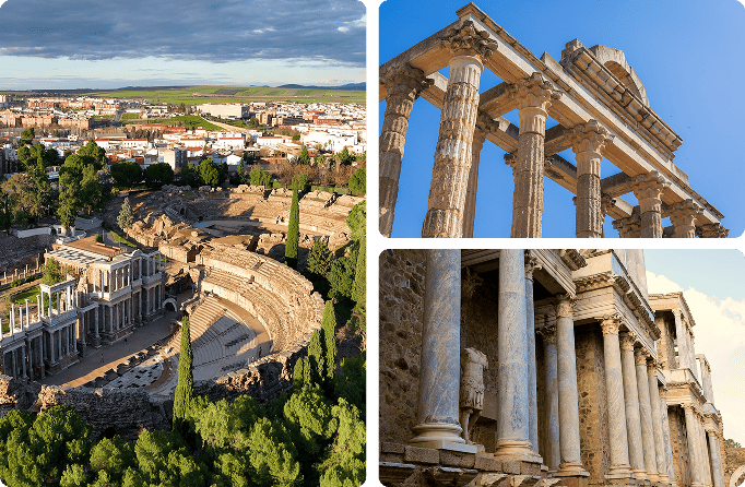 El gran protagonista es el Teatro Romano de Mérida, uno de los mejor conservados del mundo, donde aún hoy se celebran espectáculos. Muy cerca se encuentra el Anfiteatro Romano de Mérida, que ayuda a imaginar la vida cotidiana en la antigua Emérita Augusta. Tampoco puede faltar un paseo por el Puente Romano de Mérida, especialmente al atardecer, ni una visita al Templo de Diana, integrado en pleno centro urbano.