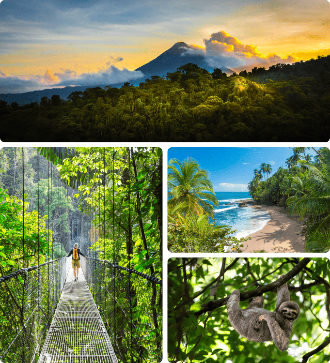 Empieza tu aventura en Tortuguero, navegando entre canales rodeados de selva y fauna salvaje (monos, caimanes, aves, tortugas). Sigue rumbo al Volcán Arenal, donde te esperan aguas termales, senderos y vistas de postal. Y termina entre las nubes en Monteverde, con sus famosos puentes colgantes, su jardín de mariposas y su bosque mágico. ¿A que esperas para descubrir Costa Rica? Te prometemos que es ¡Pura vida!