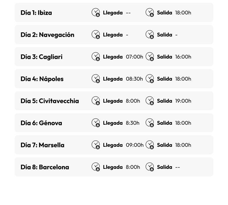 - Parada en Cagliari (Italia), Napoles (Italia), Civitavecchia (Italia), Genova (Italia), Marsella (Francia) y fin de viaje en Barcelona.