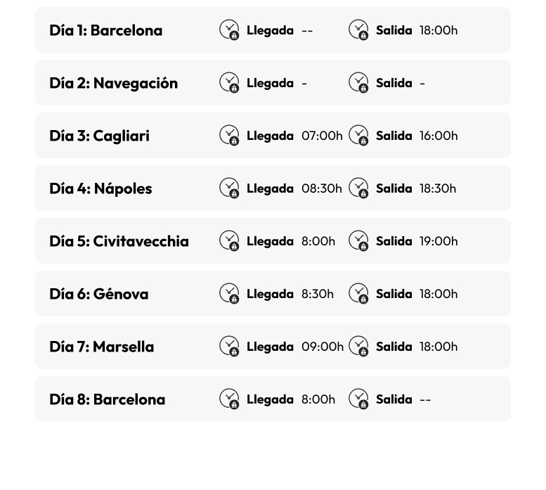- Parada en Cagliari (Italia), Napoles (Italia), Civitavecchia (Italia), Genova (Italia), Marsella (Francia) y fin de viaje en Barcelona.