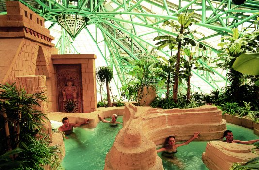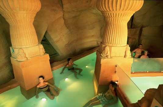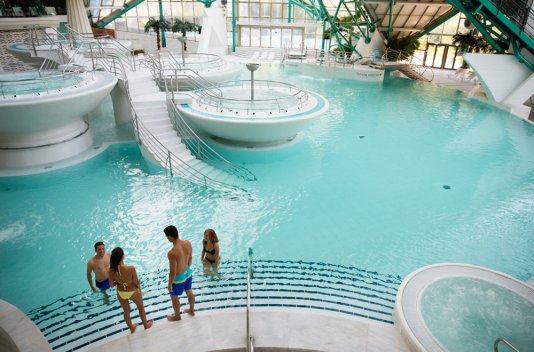 • Cuenta con diferentes espacios, lagunas interiores exterioressaunas, baños turcos, baños de pomelos, jacuzzis y chorros de agua... que aprovechan las aguas termales naturales que brotan a 70 grados de temperatura. Estas aguas son muy ricas en minerales y aportan bienestar y salud.